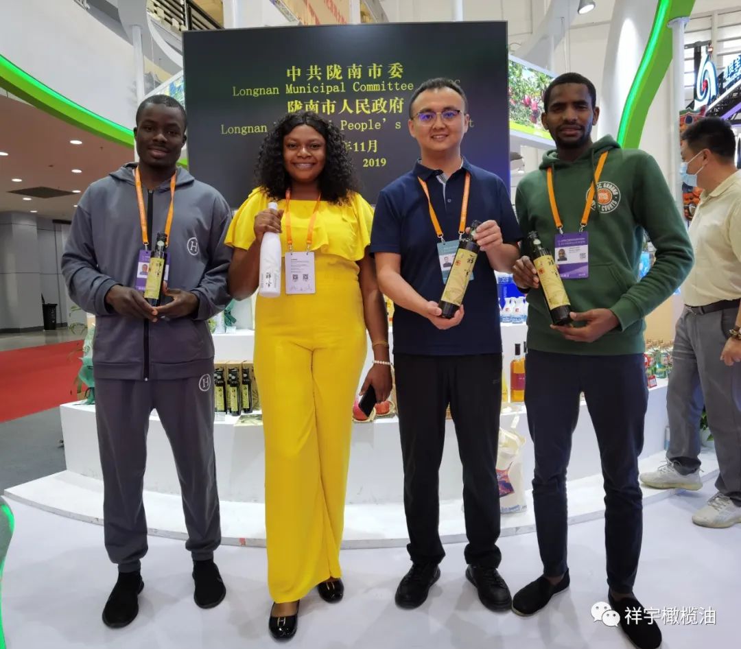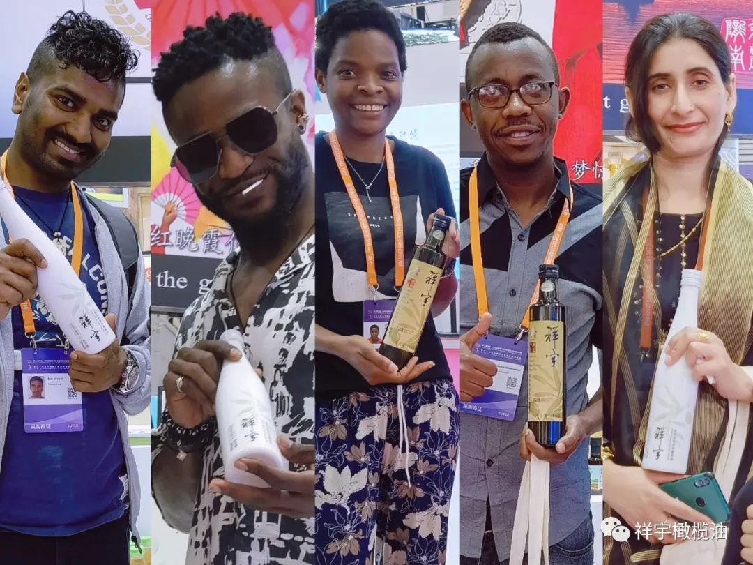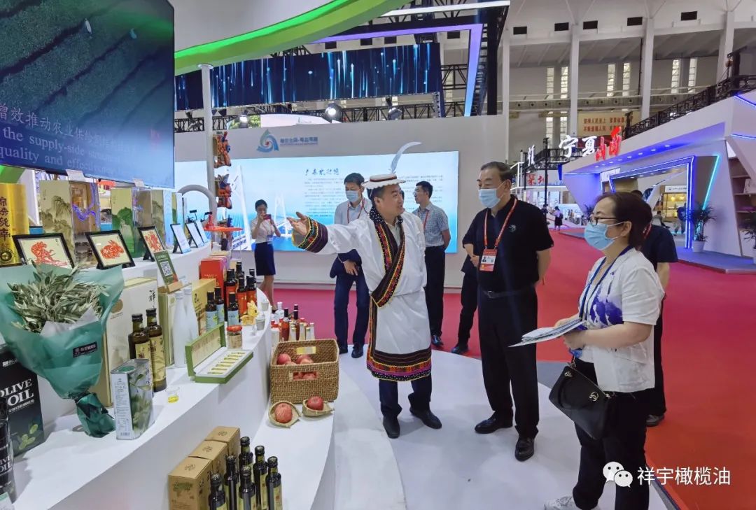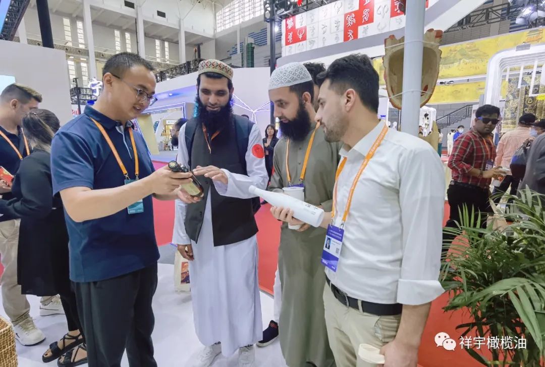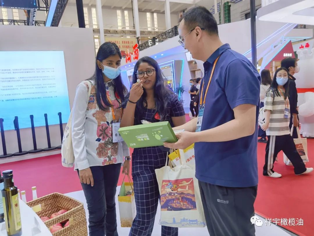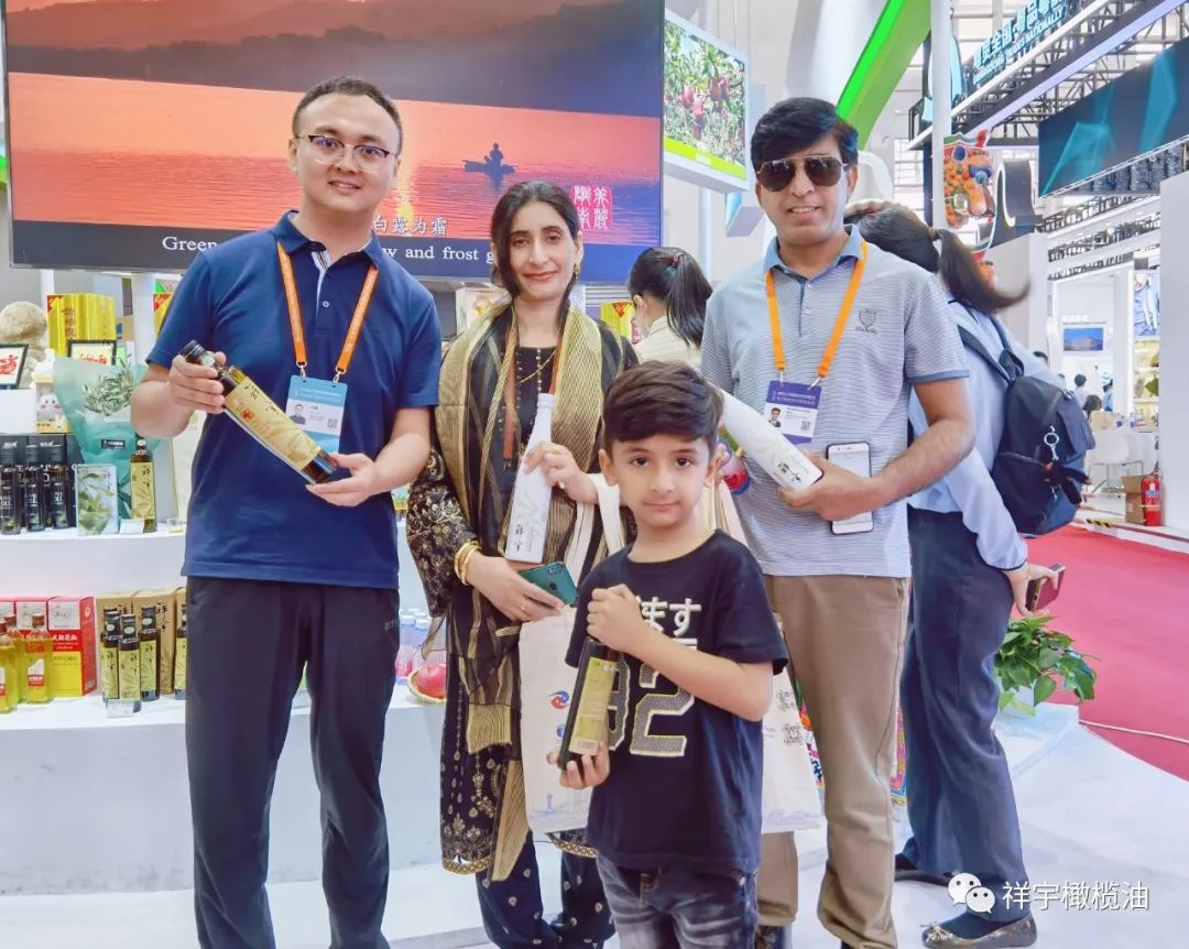 展會現(xiàn)場,來賓、客商紛紛到祥宇橄欖油展臺前駐足品鑒,