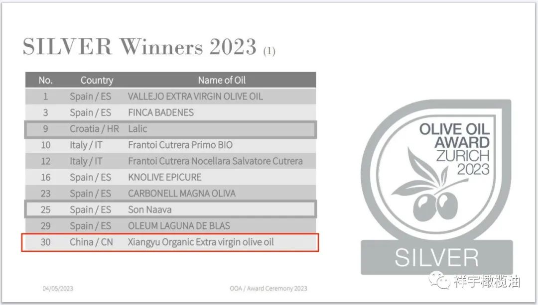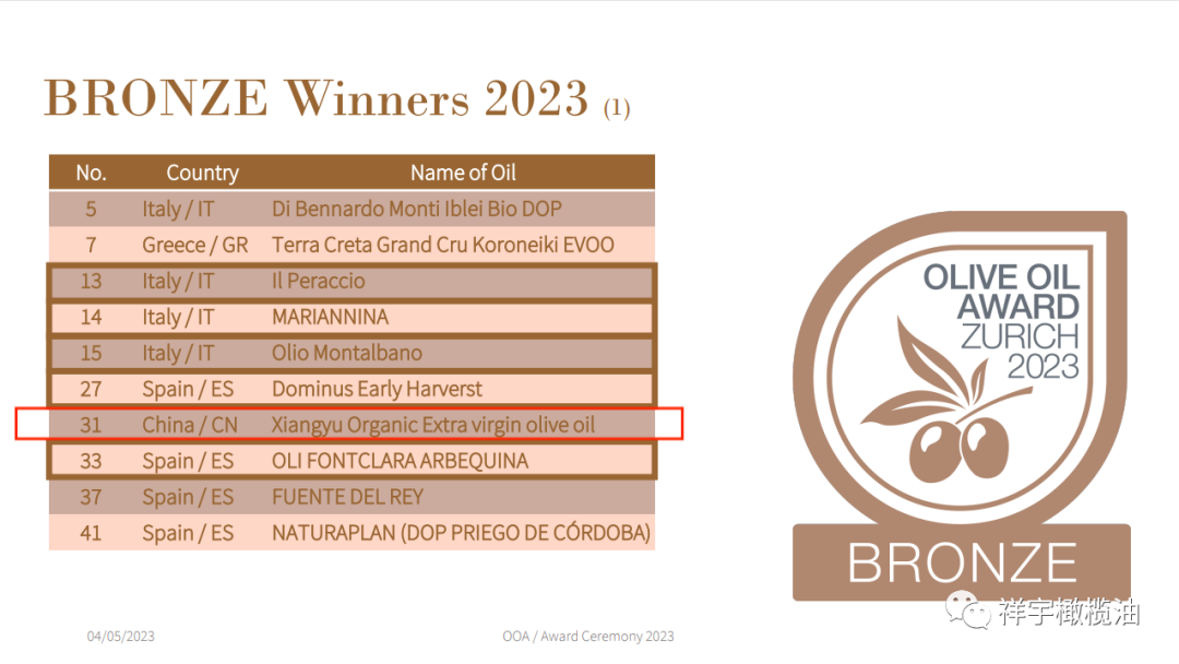祥宇選送的特級初榨橄欖油在10個(gè)國家126個(gè)樣品中獲得1銀1銅的好成績。